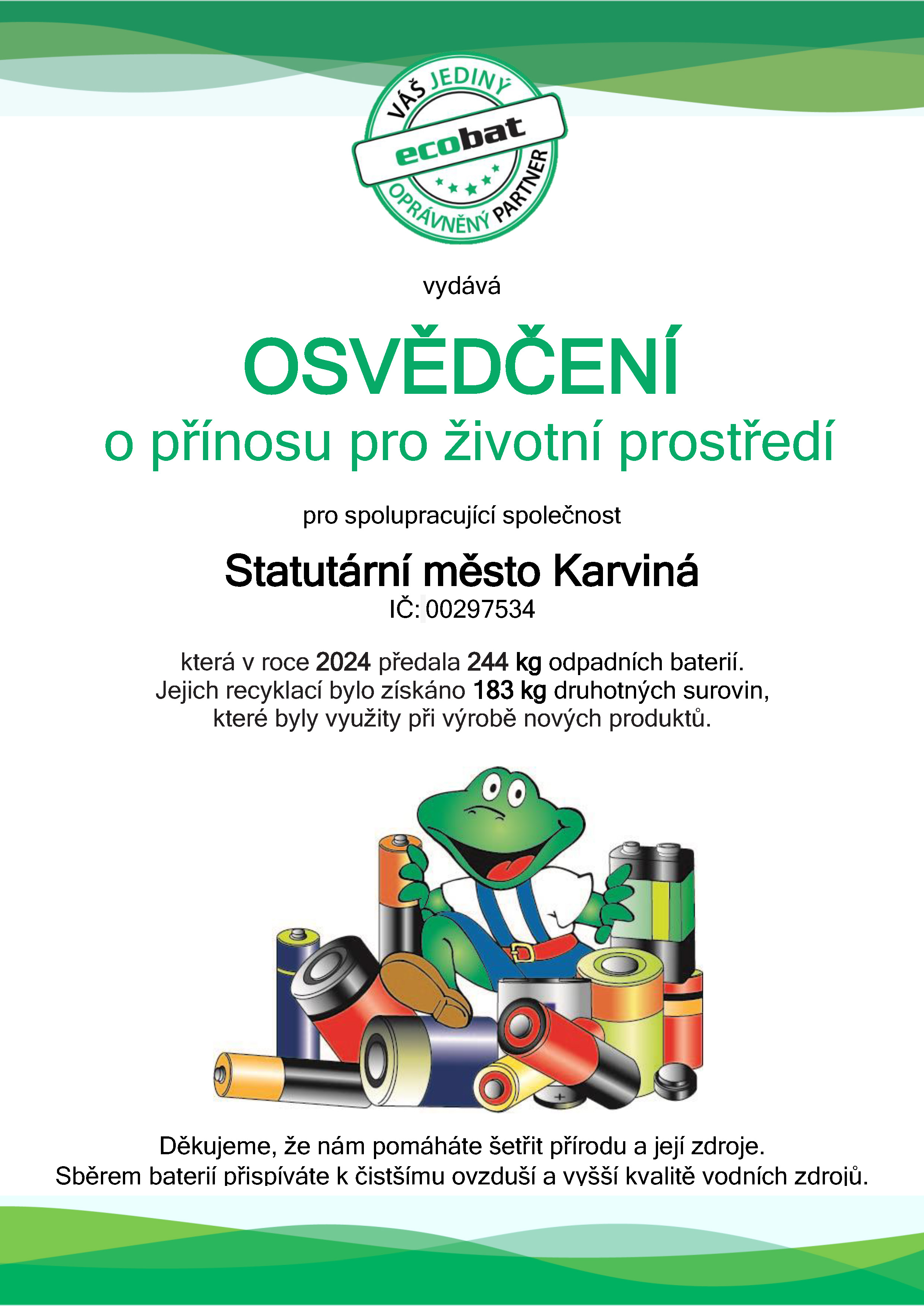 30.01.2025 – Ecobat je česká neziskově hospodařící společnost, která již dvacet let zajišťuje komplexní služby zpětného odběru baterií a recyklaci vysloužilých elektrospotřebičů. Karviná za rok 2024 předala Ecobatu 244 kilogramů odpadních baterií, jejichž recyklací bylo získáno 183 kilogramů druhotných surovin, které byly využity při výrobě nových produktů.