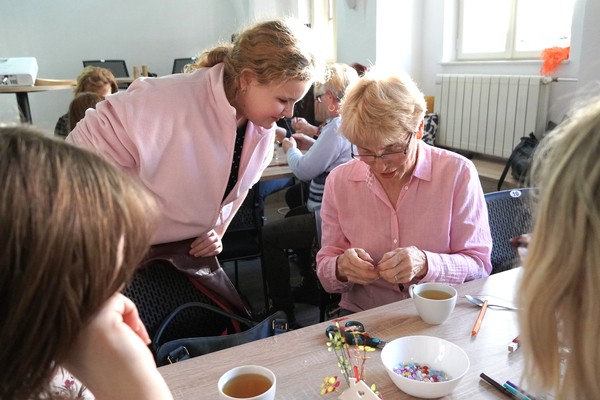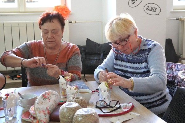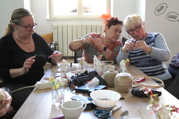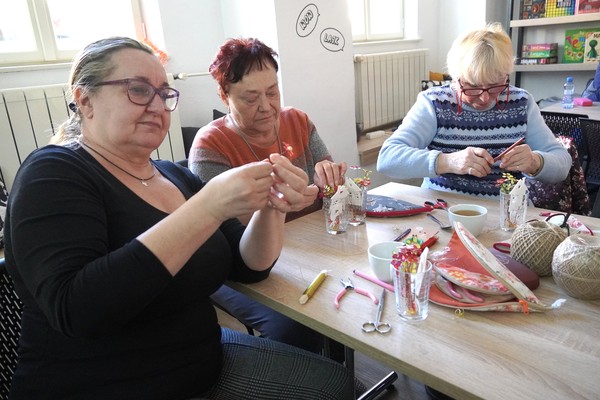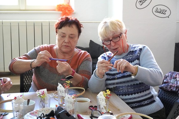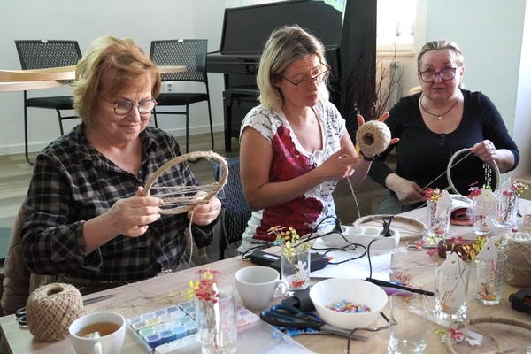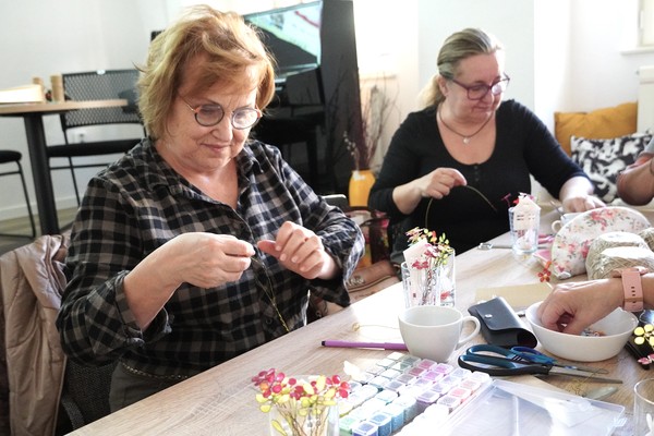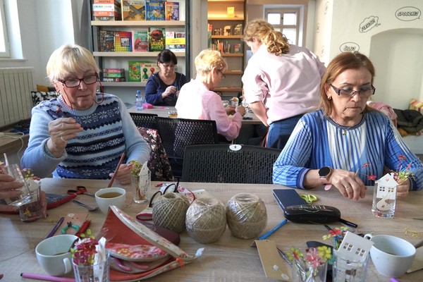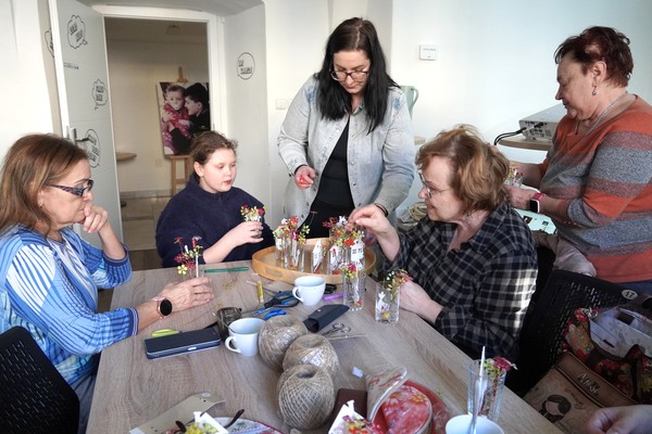 U jednoho ze stolů se sešly příznivkyně tvoření, které si tuto aktivitu nenechávají ujít každý měsíc. Nad dobrou kávou nebo čajem, mezi lehkým povídáním, se daly do práce a proměnily materiály v jemně propracované dekorace. „Chodím sem pravidelně každý měsíc a vždy se těším. Knihovnice jsou šikovné a pokaždé připraví něco nového. Jarní věnec mě oslovil hlavně díky drátkování a trošku makramé. Je to puntičkářská práce, při které se člověk soustředí na každý detail a zároveň si vyčistí hlavu od starostí. Navíc je tu vlídné prostředí se spoustou příjemných lidí,“ uvedla návštěvnice Helena Kolibová. Výrobu jarního věnce pro radost si přišli vyzkoušet také klienti Domova Alzheimer Darkov.