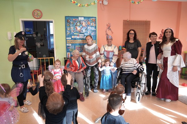 Diskotéka s dětskými písničkami vytvořila přirozený prostor pro společné chvíle – děti tančily v kostýmech, senioři je povzbuzovali, zapojovali se do pohybu a sdíleli s nimi radost z karnevalové atmosféry. Právě podobná setkání umožňují přirozený kontakt mezi generacemi a obohacují běžný program obou skupin.